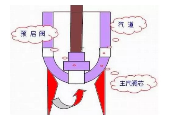 高壓主汽閥閥蝶上鉆有通孔,閥桿端部從孔中穿過。預(yù)啟閥置于閥桿的端部,預(yù)啟閥于閥桿連成一體,當(dāng)閥桿動(dòng)作要打開主閥時(shí),預(yù)啟閥先打開進(jìn)少量蒸汽,使主閥前后壓差減小,同時(shí)預(yù)熱主閥后管道和高壓調(diào)節(jié)閥閥殼預(yù)啟閥的作用就是在主閥還未動(dòng)作的時(shí)候,預(yù)啟閥預(yù)先動(dòng)作,其打開后,會(huì)有小流量蒸汽通過預(yù)啟閥芯到達(dá)主閥后,以降低主閥前后壓差,有利于主閥的順利開啟,同時(shí),由于預(yù)啟閥的通徑較主汽閥小得多,它便于用小流量蒸汽對(duì)汽輪機(jī)進(jìn)行沖轉(zhuǎn)并升速。